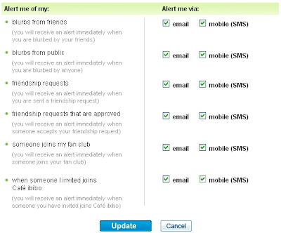 Mobile SMS alerts and email alerts: You can be a trusted member in cafe ibibo, if provide your mobile phone number. Apart from this, you can even receive SMS event alerts for the activities like, new friend requests, blurbs etc.