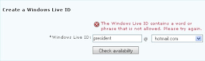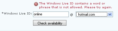 The error message goes like this “The Windows Live ID contains a word or phrase that is not allowed. Please try again“.