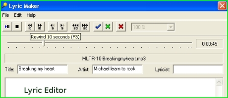 JetAudio is an exception. If you install JetAudio you will get some extra tools that is meant for music editing and processing. One among them is Lyric Maker. The Lyric Maker comes with controls for playing or fast forwarding the song with specified amount of time. It comes with an integrated text editor that can help you to type down the lyric, while you listening to the song.